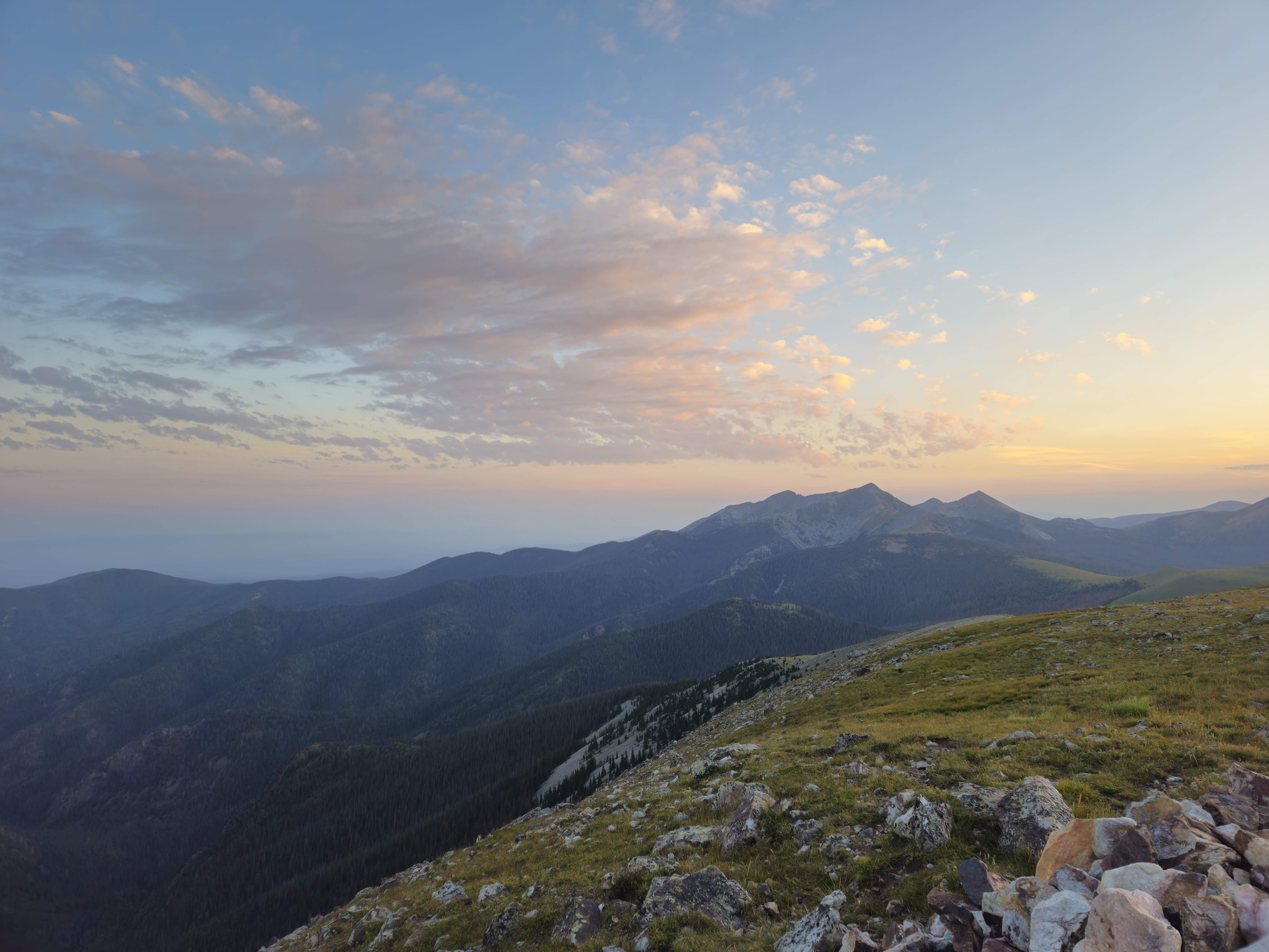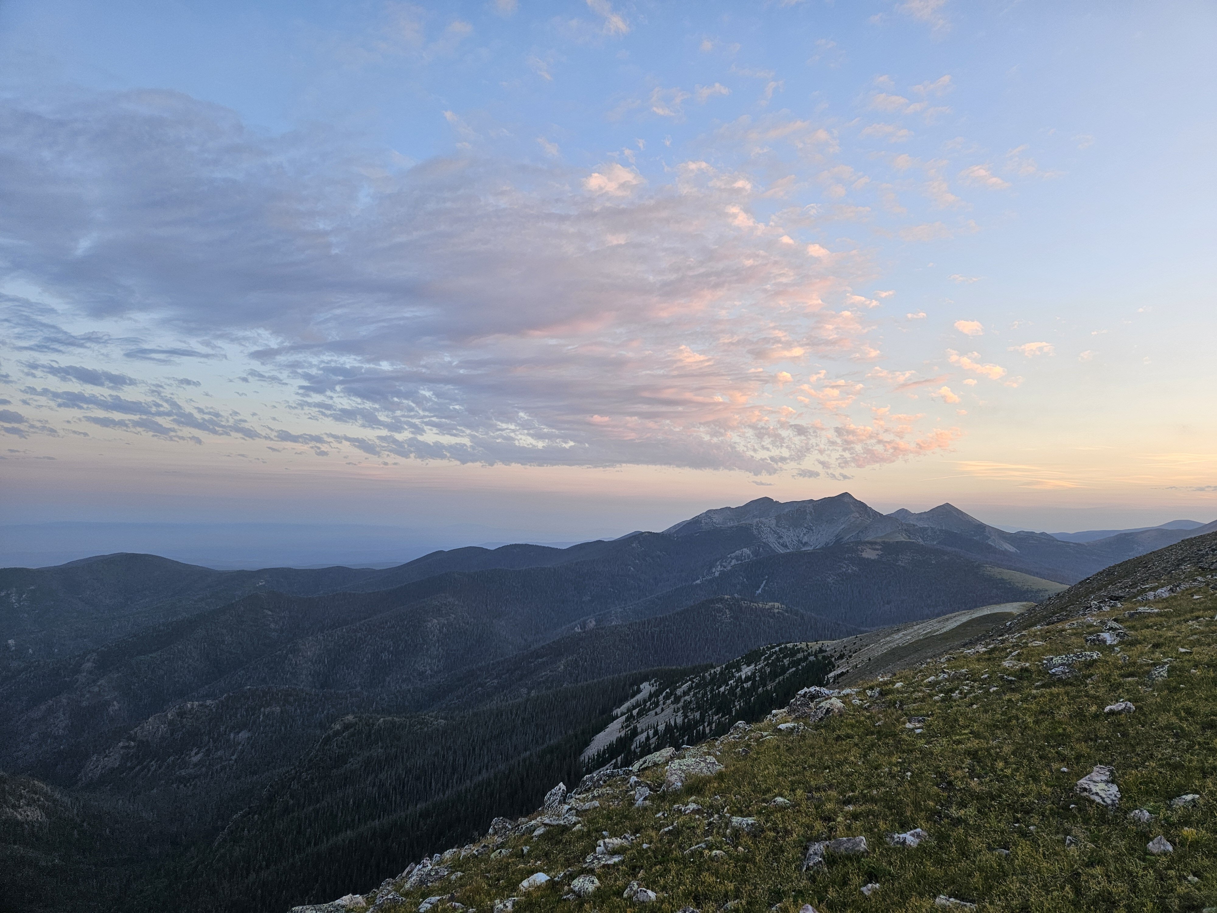 Having not slept at all during the night after having climbing Truchas, I got up an hour before sunrise and hit the trail. It was a relatively quick hike to the peak. Headlamped and blistered I marched my way to the top to catch the sunrise.