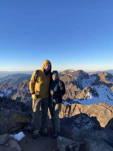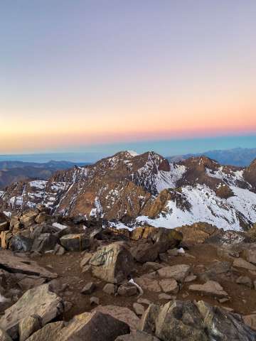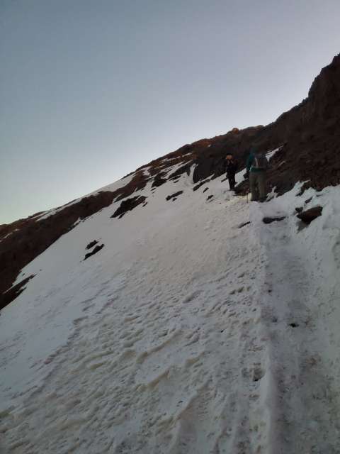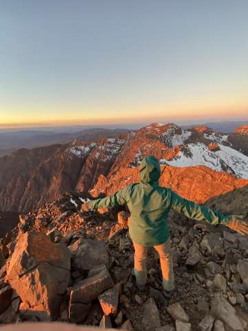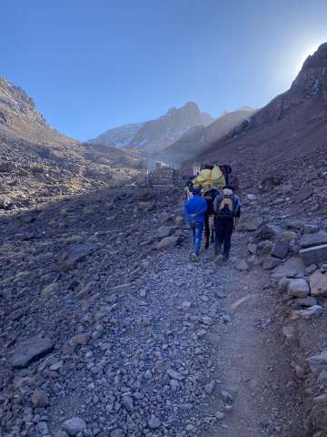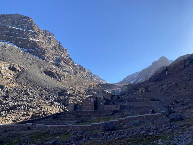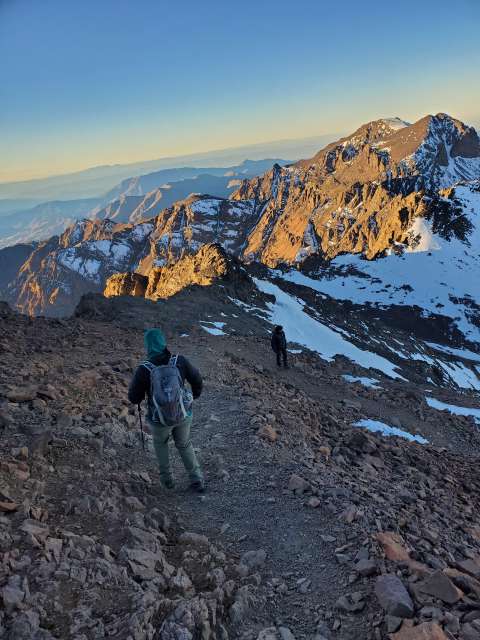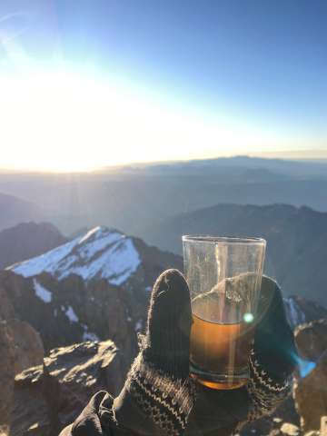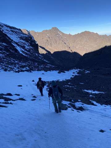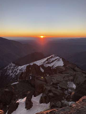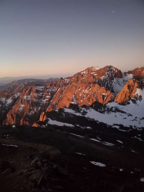 We started before sunrise the next day hiked for a bit before putting on our crampons. A lady had died earlier in the season from slipping on the ice near the top so we tread lightly. As the sun was rising we summited Toubkal. It was freezing cold, but our guide provided some tea to warm us up and shared some dates and nuts. After snapping some photos we began the long descent back to the valley below.