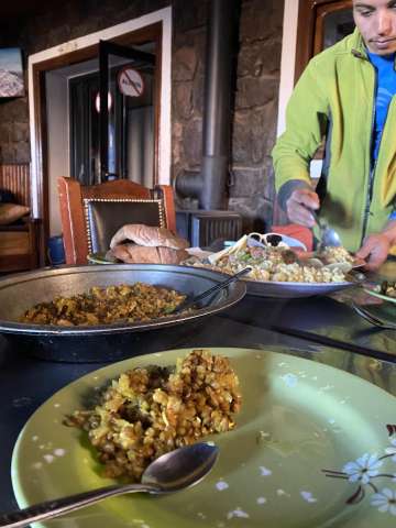 We stopped for lunch near a river crossing where our mule carrying our sleeping supplies caught up. Tending to the mule was our chef who began to prepare us a delicious “traditional” lunch, served of course with tea. After lunch we continued our ascent. The hike was not particularly steep or difficult, just a long unrelenting climb. Eventually we ended up at the hut where we would spend the night. It was still a few 1000 feet short of the summit, but made a great base from which to rest and prepare for the summit the following morning.