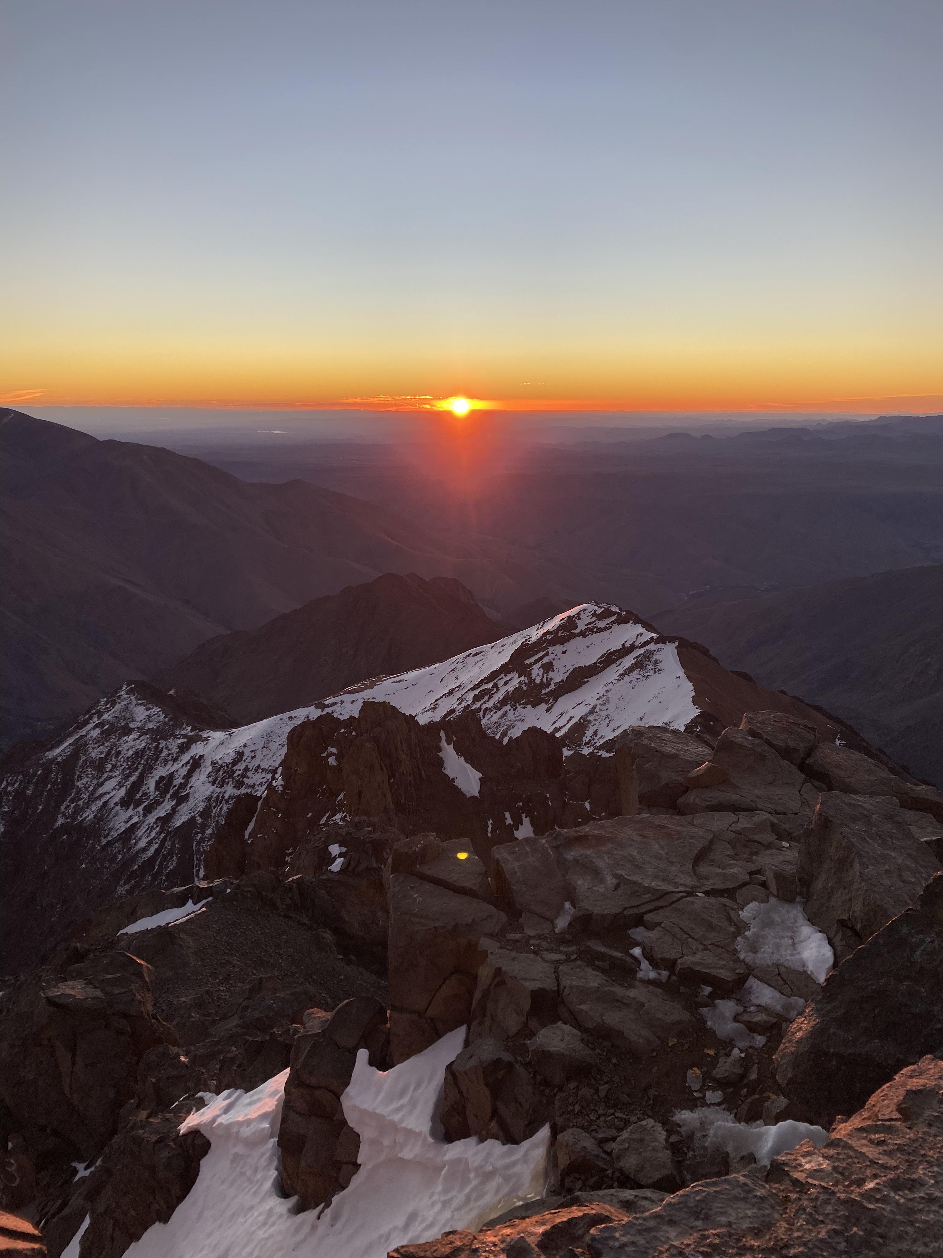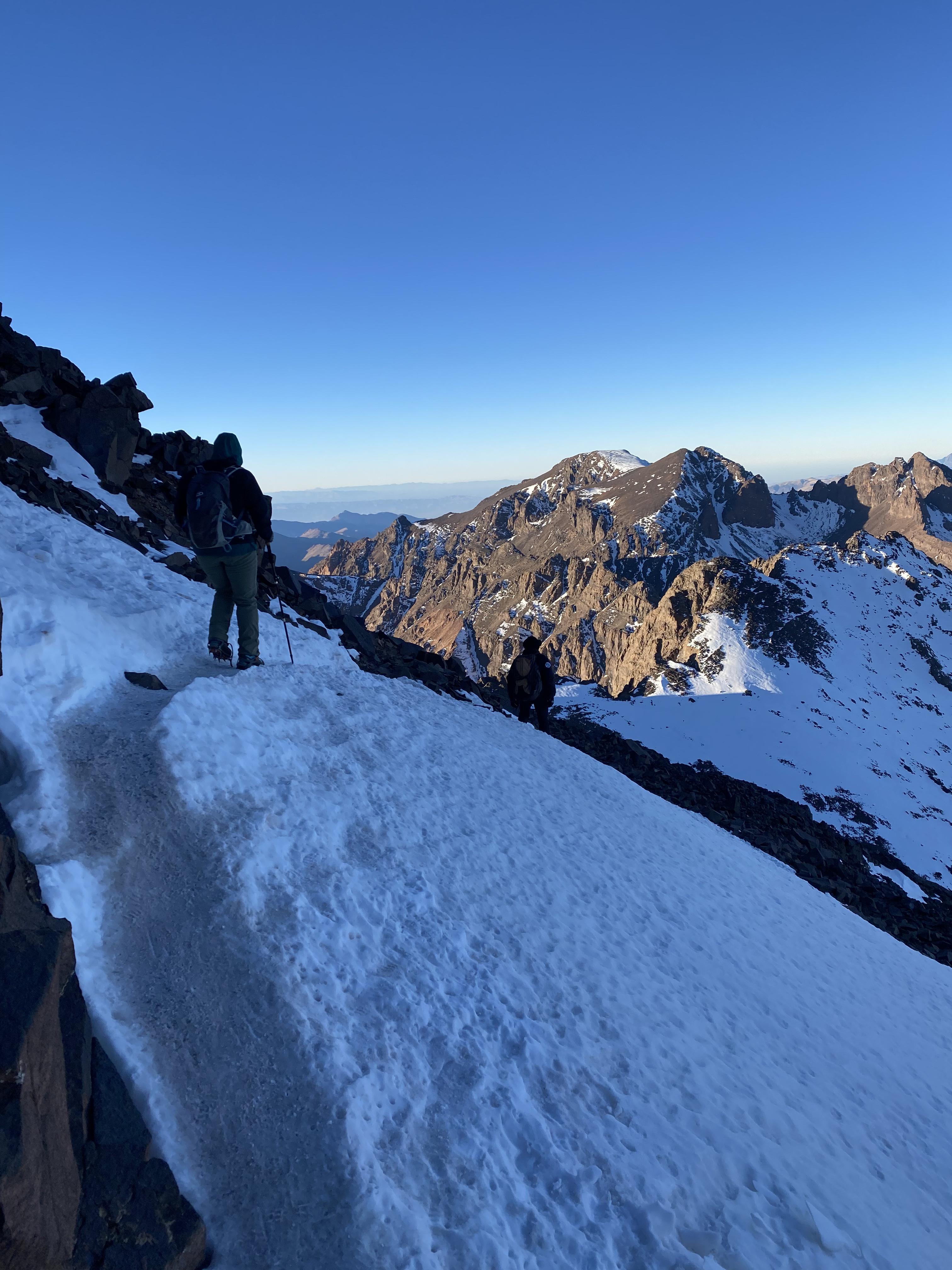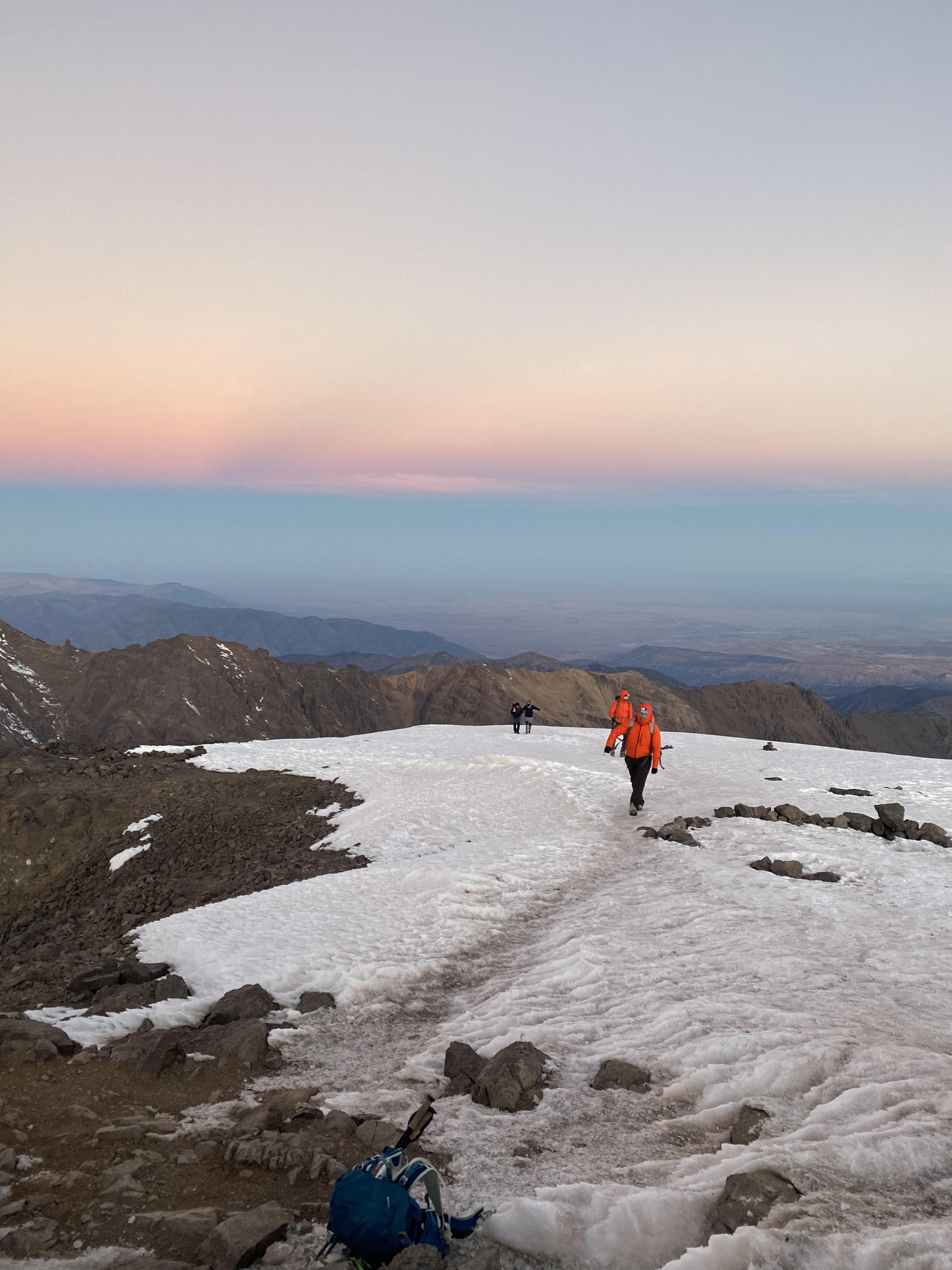 We started before sunrise the next day hiked for a bit before putting on our crampons. A lady had died earlier in the season from slipping on the ice near the top so we tread lightly. As the sun was rising we summited Toubkal. It was freezing cold, but our guide provided some tea to warm us up and shared some dates and nuts. After snapping some photos we began the long descent back to the valley below.