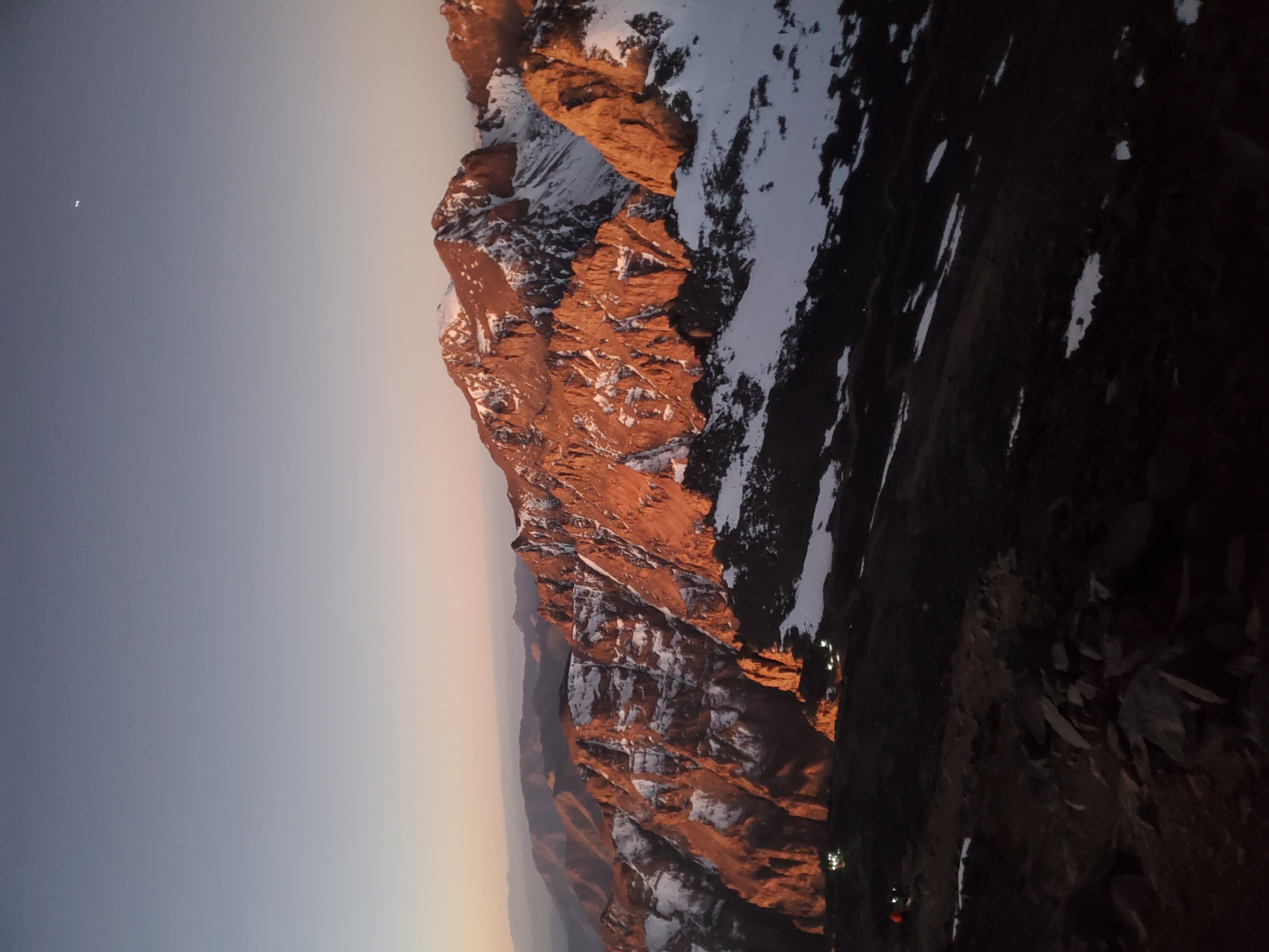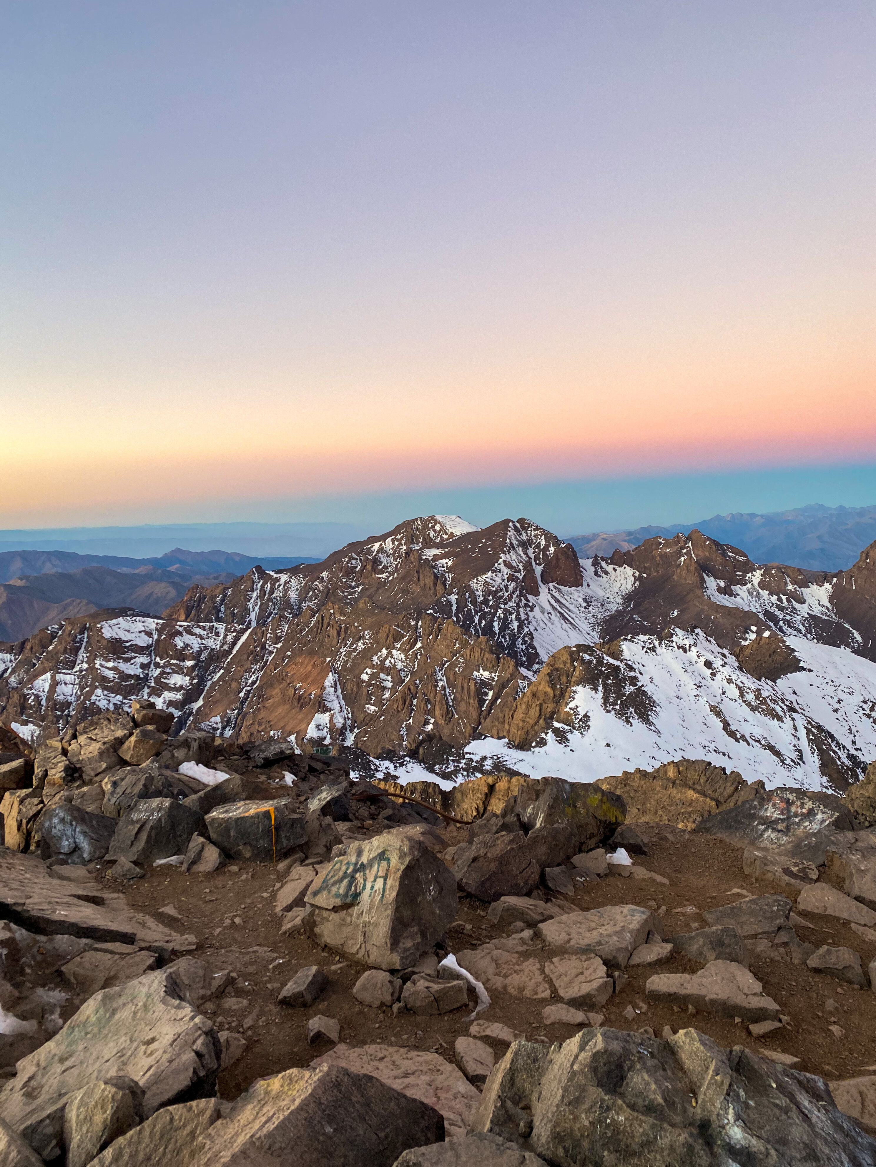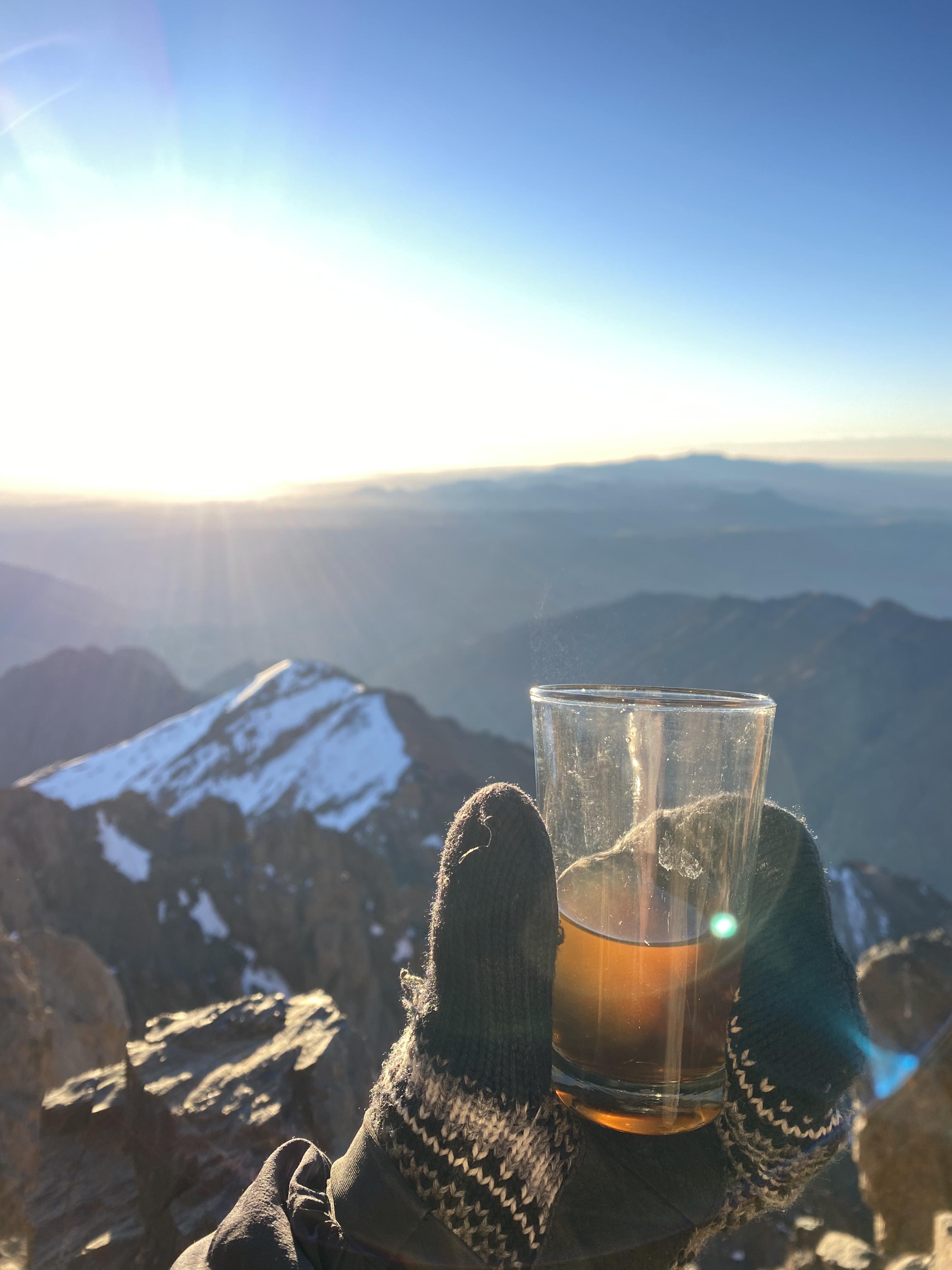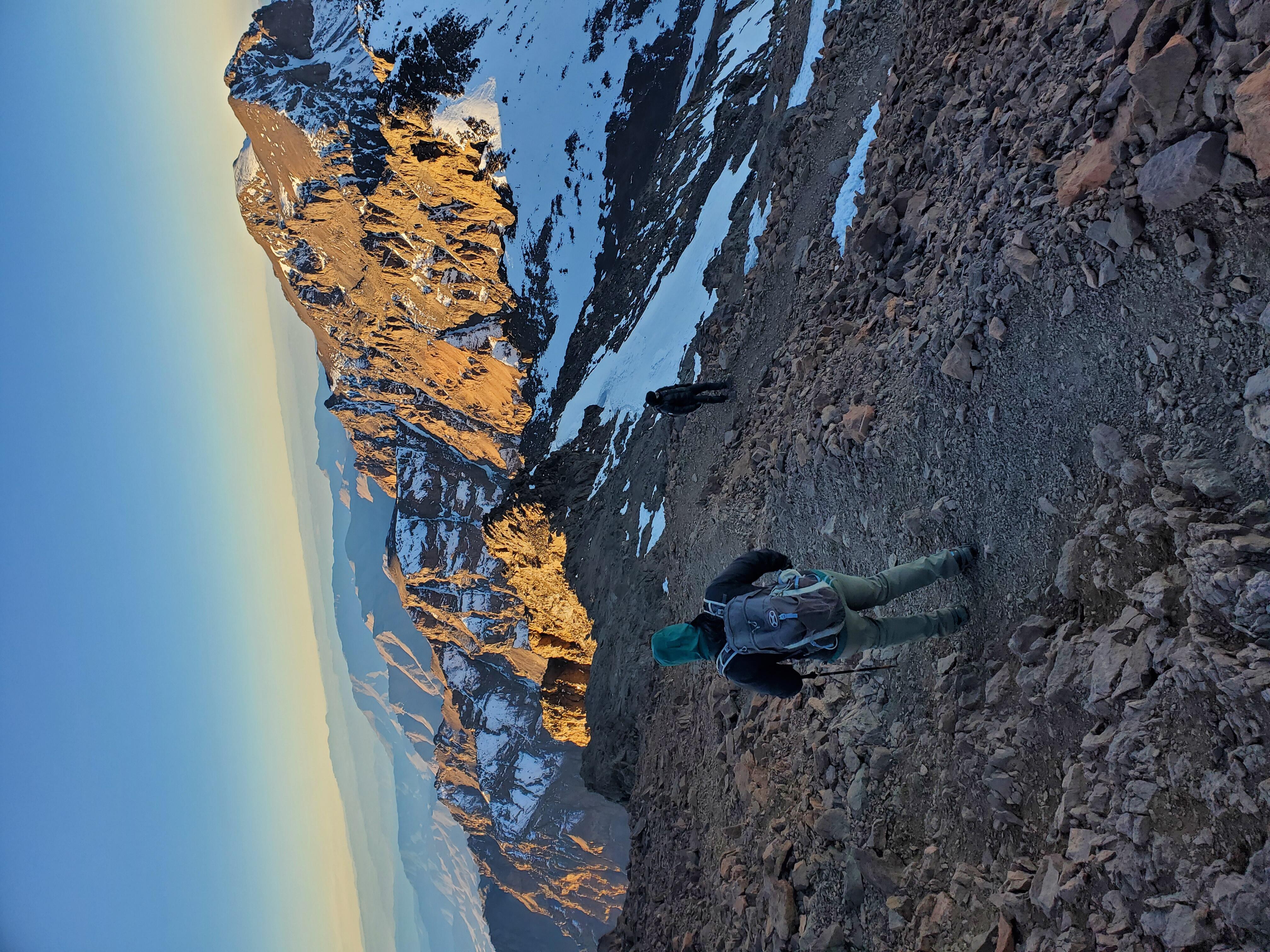 We started before sunrise the next day hiked for a bit before putting on our crampons. A lady had died earlier in the season from slipping on the ice near the top so we tread lightly. As the sun was rising we summited Toubkal. It was freezing cold, but our guide provided some tea to warm us up and shared some dates and nuts. After snapping some photos we began the long descent back to the valley below.