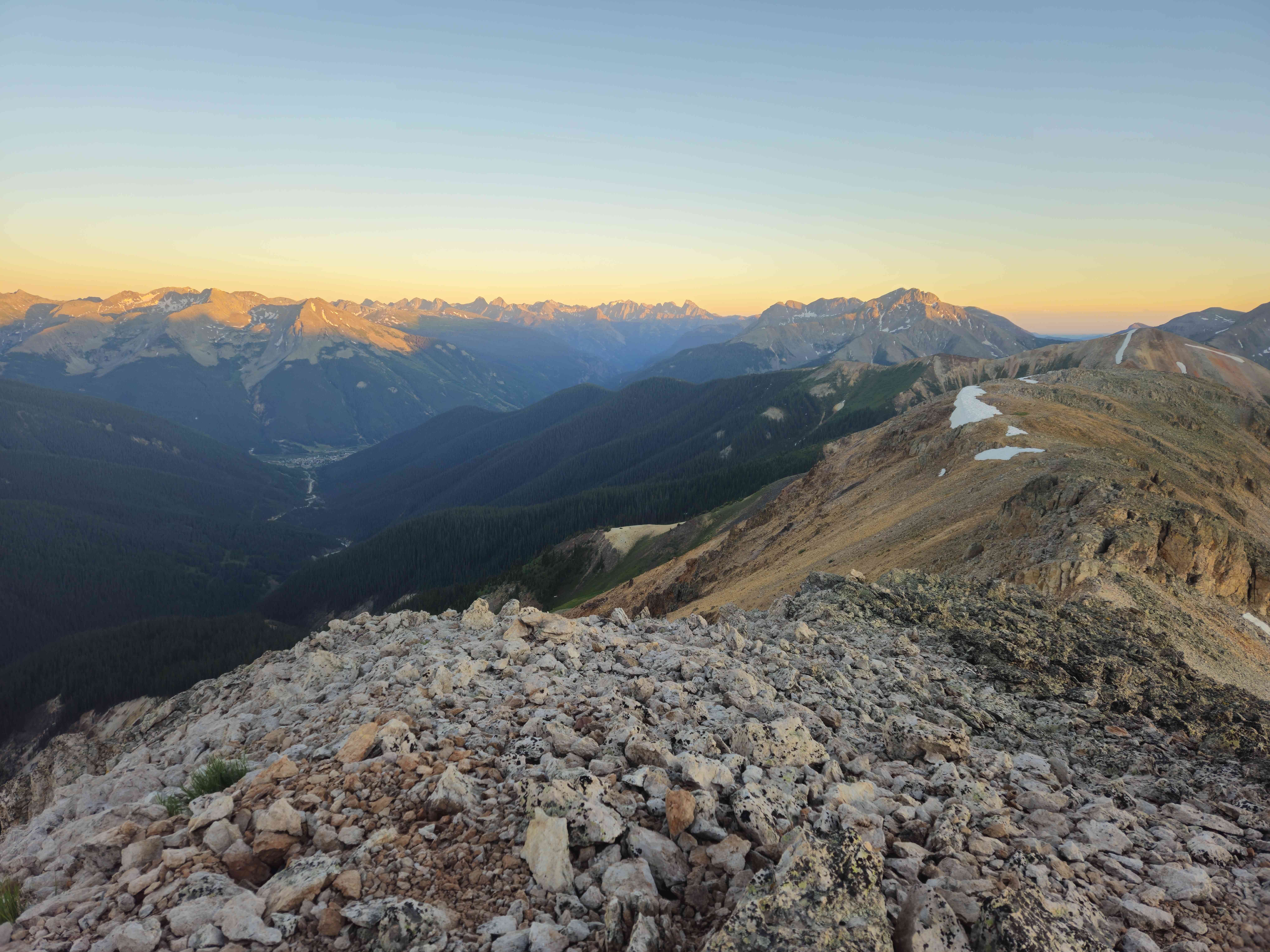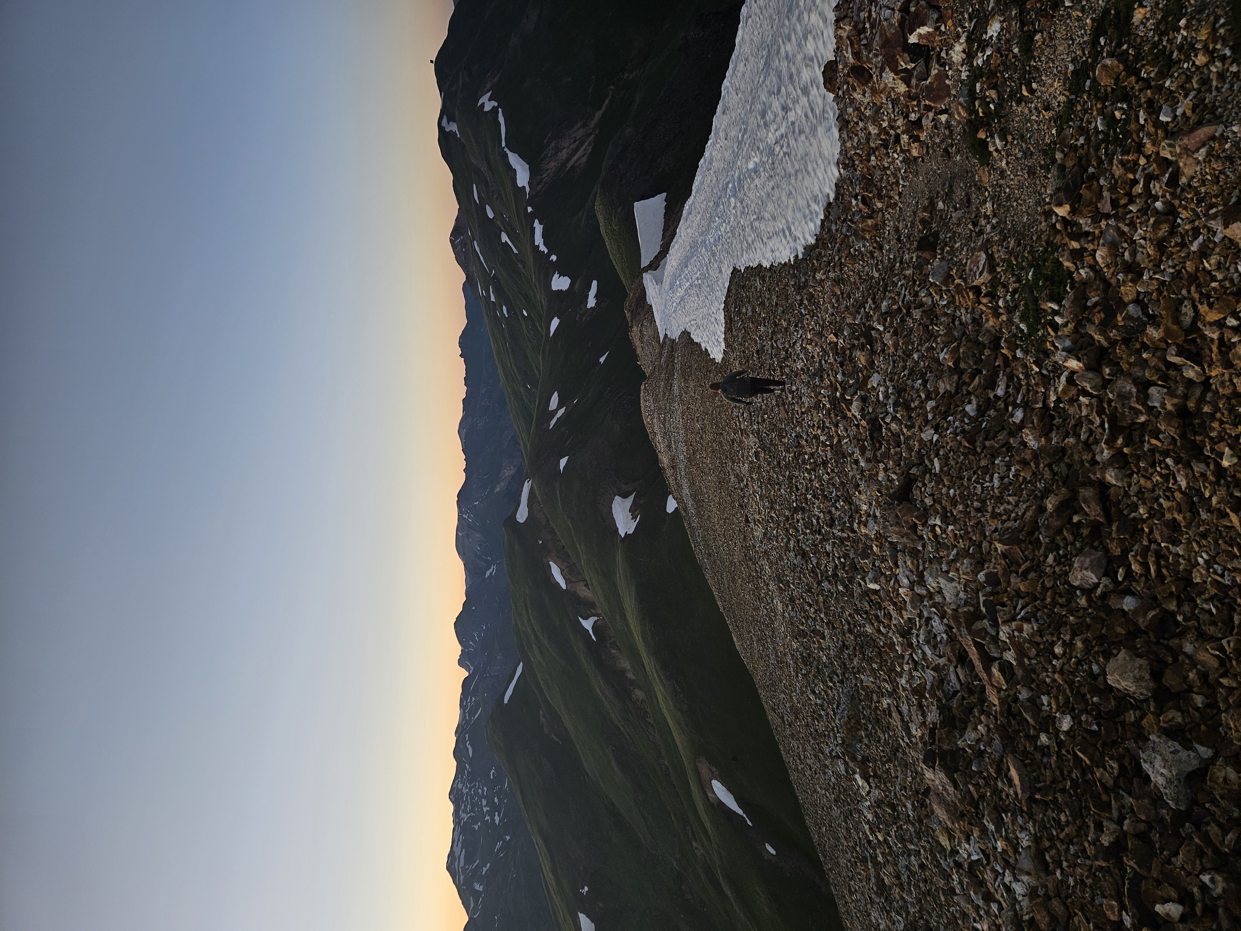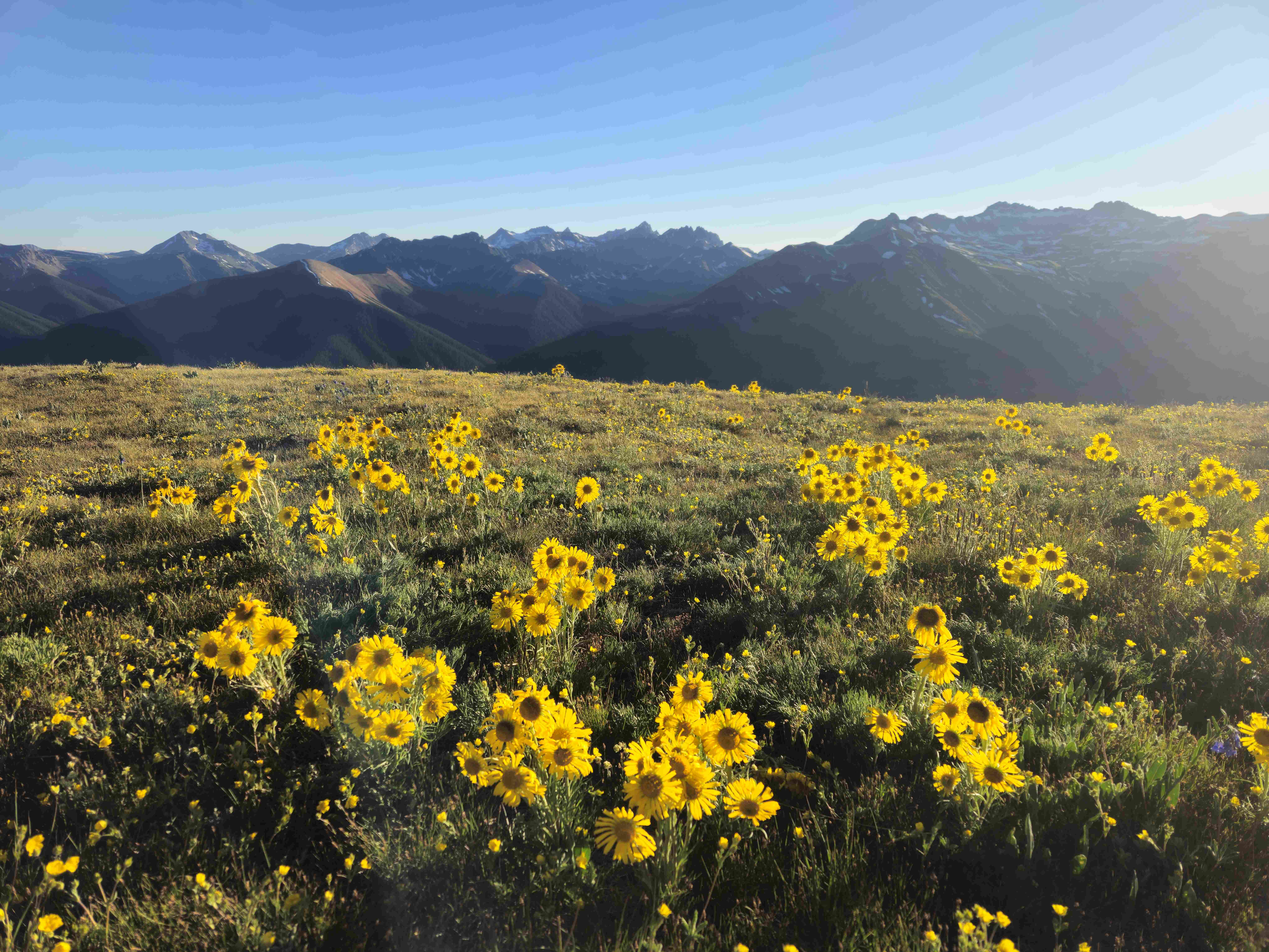 The conditions were awesome. The wild sunflowers were out. The entire hike was above treeline in the alpine which is my favorite. I frolicked down from US Basin and met Jo at the saddle below Ohio where an old miners hut was located. Together we climbed the rest of the way to the summit as the sun was going down.