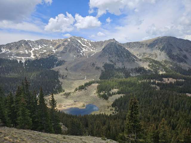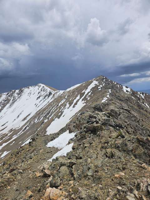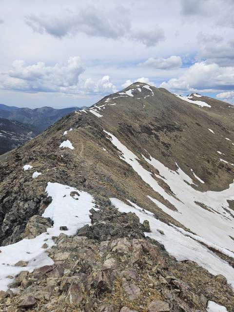 Wheeler is a breeze compared to any other peaks in the Sangre De Cristo mountains. Everything else is like 12+ miles. Anyway, getting to the lake was easy and I wanted to head to up to the peak. I had originally played with the idea of trying to get to Lake Fork Peak from that basin, but upon getting up there it looked to be still too covered in snow (we were on the north side). So I convinced the two girls to join me, at least until lunch 1000 feet or so below the summit. After lunch, I left them and continued to the summit.