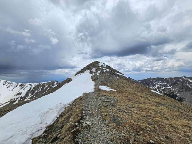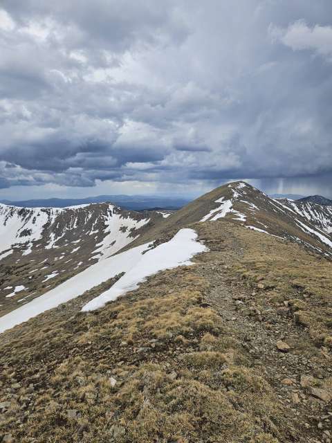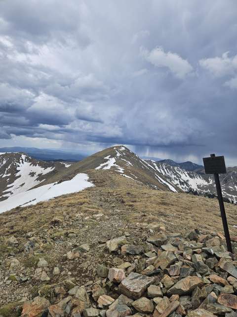 It was getting pretty dark and stormy as I was cresting the ridge, but the clouds seemed to be moving away from us, so I continued to the top of Wheeler. From there I made another judgement call and continued on to Simpson peak. After the short descent and on my way up to Simpson my legs started to cramp really badly. I’ve had that happen to me while skiing, but never while hiking. I crawled my way to the peak, drank a rootbeer and decided then to bail on continuing to Old Mike Peak. I think I could have made it, but with the weather, the cramps, and being solo, I decided to head back down.