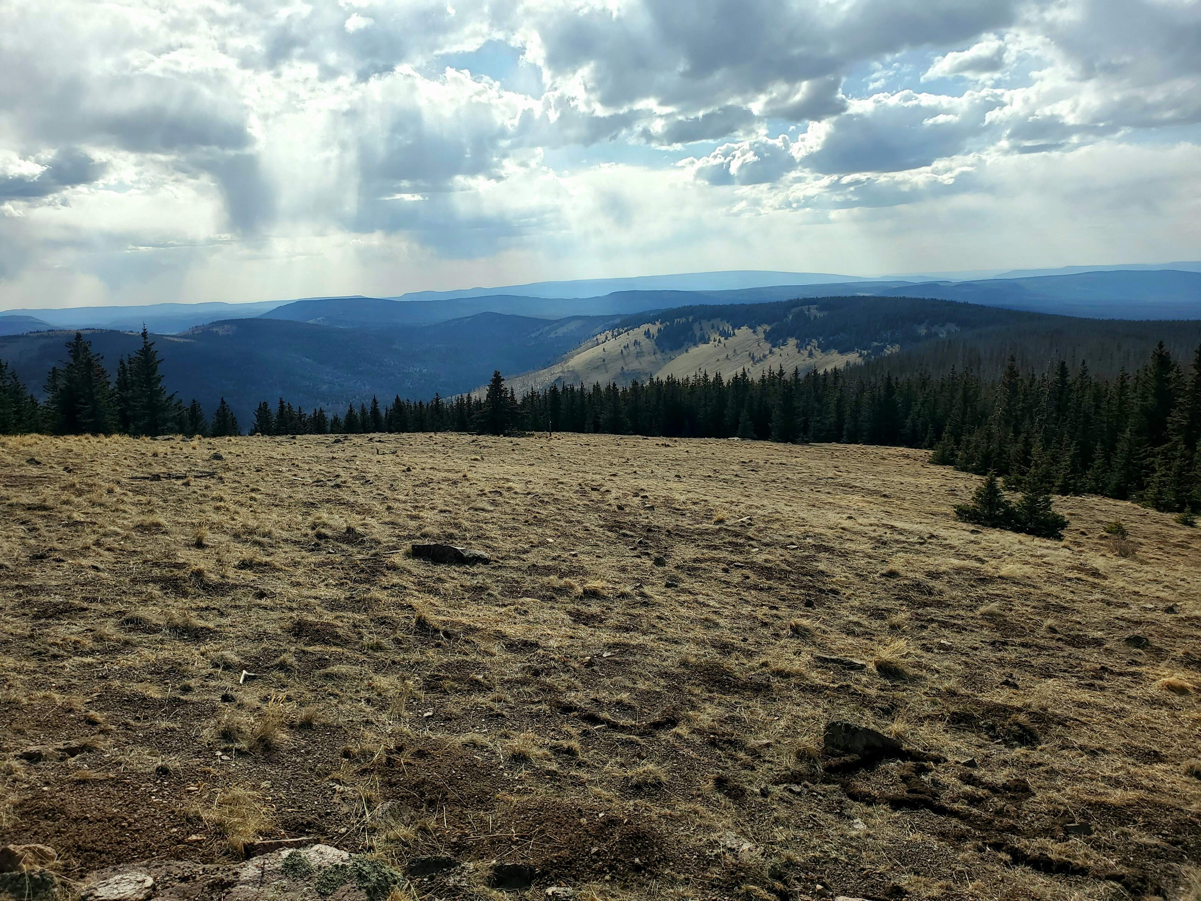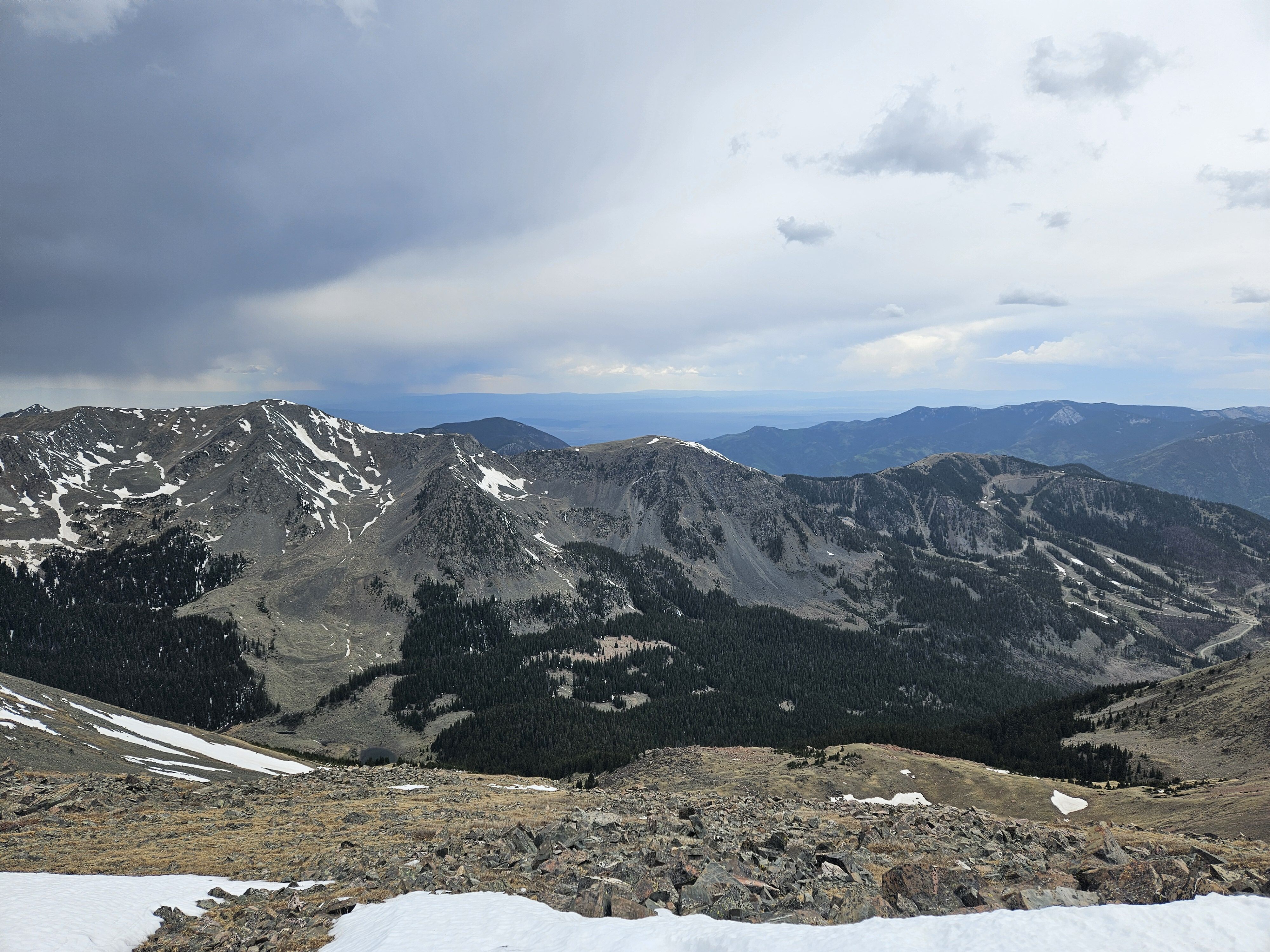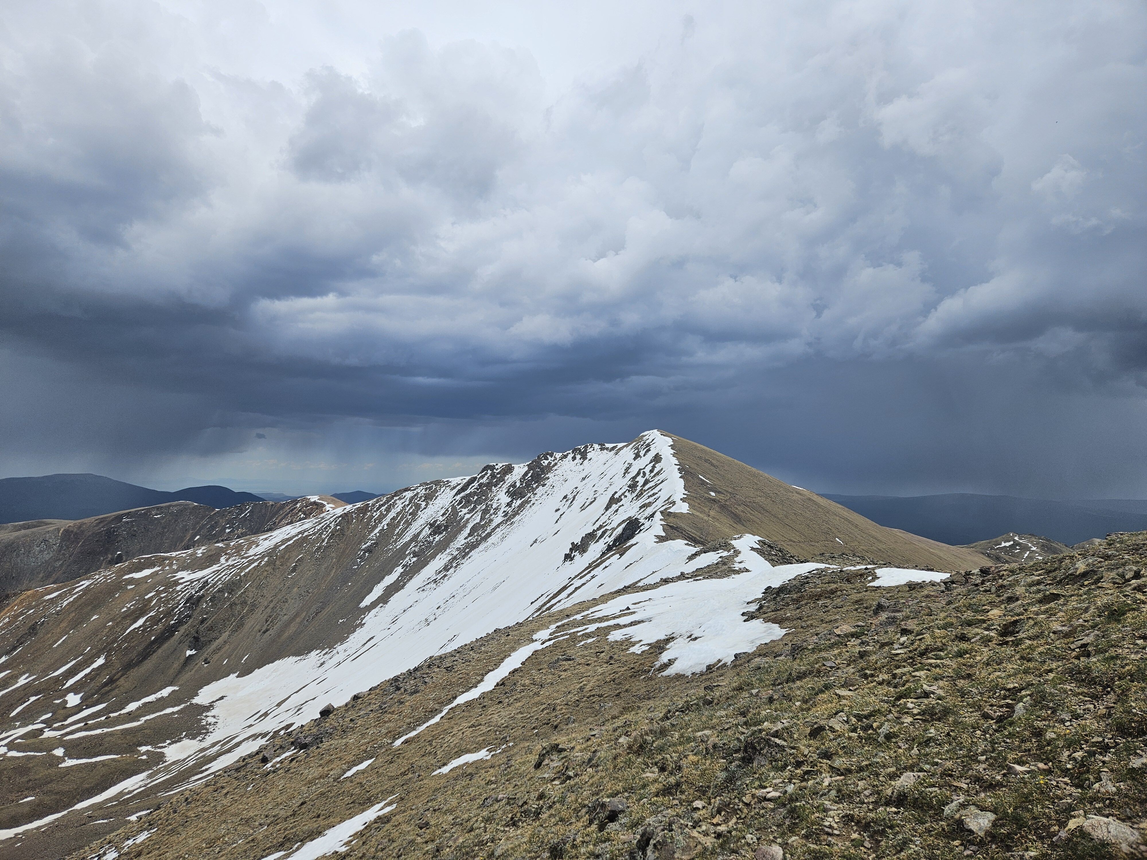 It was getting pretty dark and stormy as I was cresting the ridge, but the clouds seemed to be moving away from us, so I continued to the top of Wheeler. From there I made another judgement call and continued on to Simpson peak. After the short descent and on my way up to Simpson my legs started to cramp really badly. I’ve had that happen to me while skiing, but never while hiking. I crawled my way to the peak, drank a rootbeer and decided then to bail on continuing to Old Mike Peak. I think I could have made it, but with the weather, the cramps, and being solo, I decided to head back down.